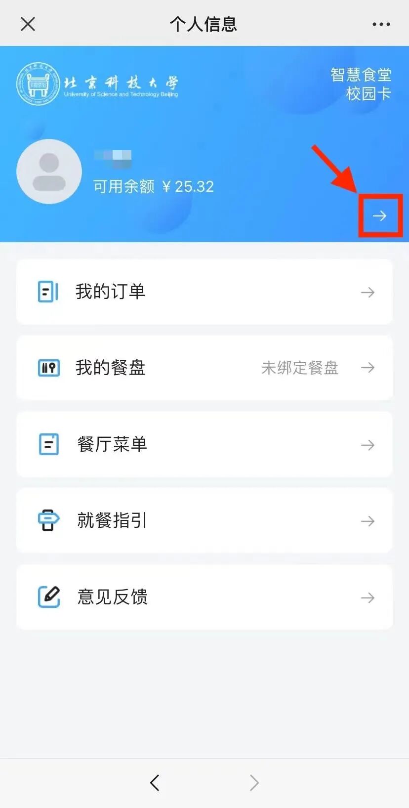 打开“北科大智慧校园”-微应用-智慧食堂