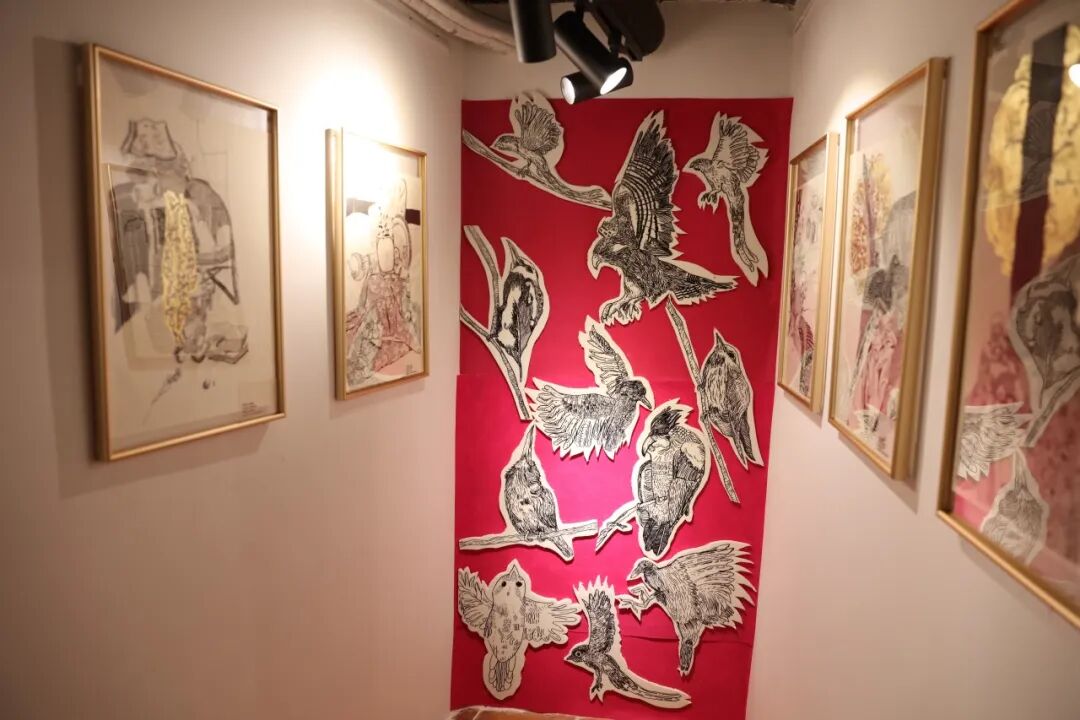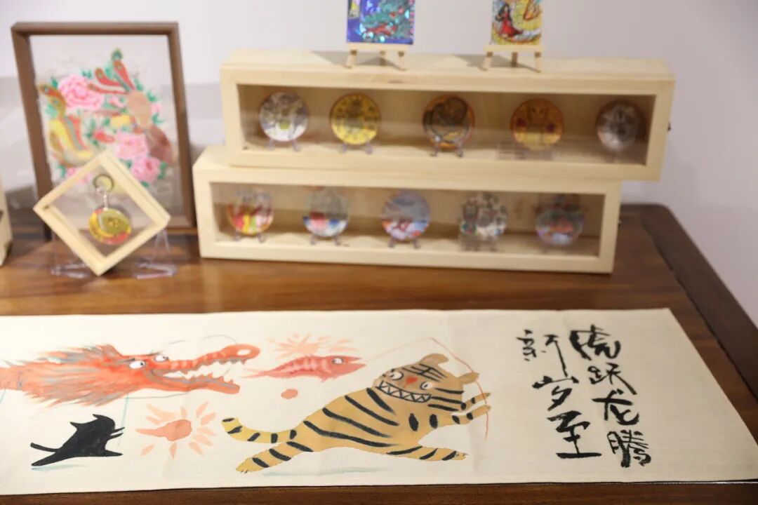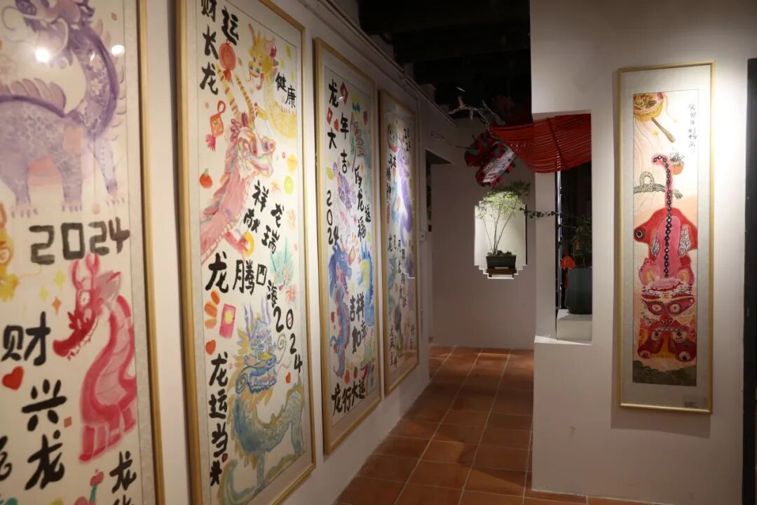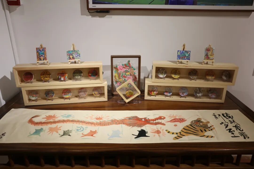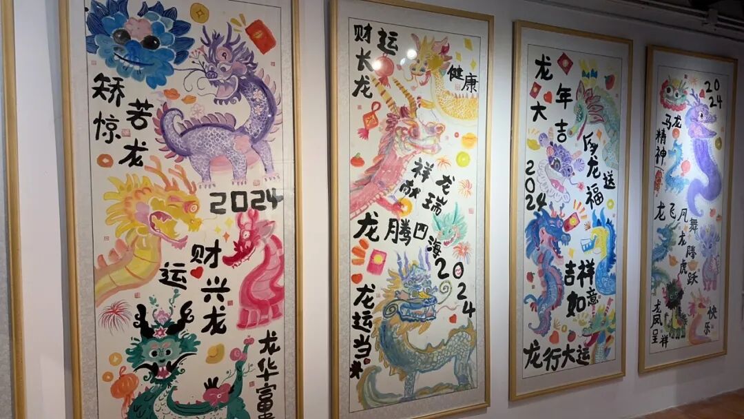 龙年,一起去打卡《龙舞华章》吧!这幅国画作品高2米,长3.6米,成了本次展览最具人气的打卡墙。画面中的龙形态各异,造型有趣,饱含学生的期盼与祝福。