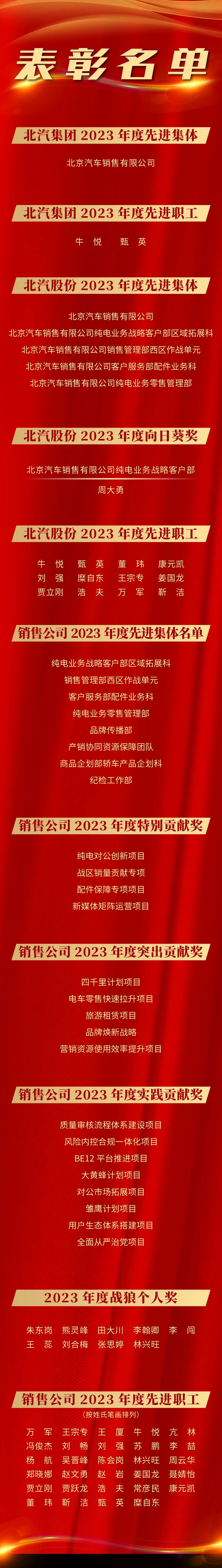 2023年,营销军团携手作战,勇往直前,书写着营销人的奋斗史诗,为公司高质量发展注入了榜样的力量!在表彰环节中,公司党委副书记、纪委书记、工会主席陈智宣读了《北京汽车销售有限公司2023年度先进集体和先进职工表彰决定》,授予纯电业务战略客户部区域拓展科等8个集体为“销售公司2023年度先进集体”荣誉称号,授予牛悦等29名同志为“销售公司2023年度先进职工”称号。