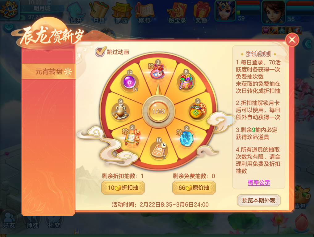 2月22日维护后至3月6日24:00,玩家可转动元宵转盘获得限时活动外观、奇珍异石、绝品宝图等好礼。