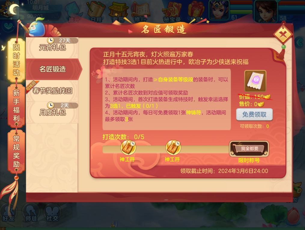 2月22日维护后至3月6日24:00,服务器等级≥70级的玩家打造到一定次数可获得神工符。