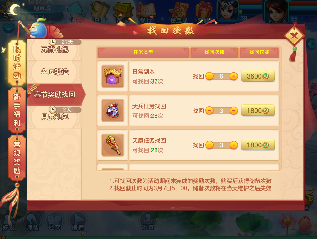 活动期间玩家未完成的副本及每日挑战奖励可于2月19日10:00至3月7日5:00期间,花费梦想币找回,详情可于活动界面处查看详细规则。