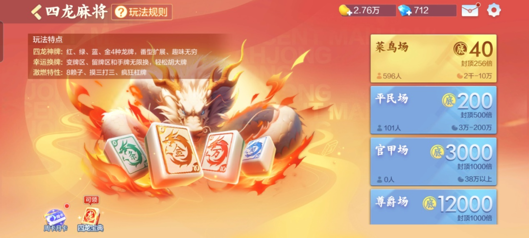 四龙麻将玩法中有着多种全新番型,这些全新番型大部分与四种龙牌有关,比如倍数高达512倍的四龙飞天番型,就需要麻友们拿到4副不同的龙牌刻子才行。当然也有难度较低的番型,比如龙刻番型,只需要拿到一副龙牌刻子就行。