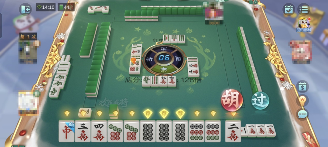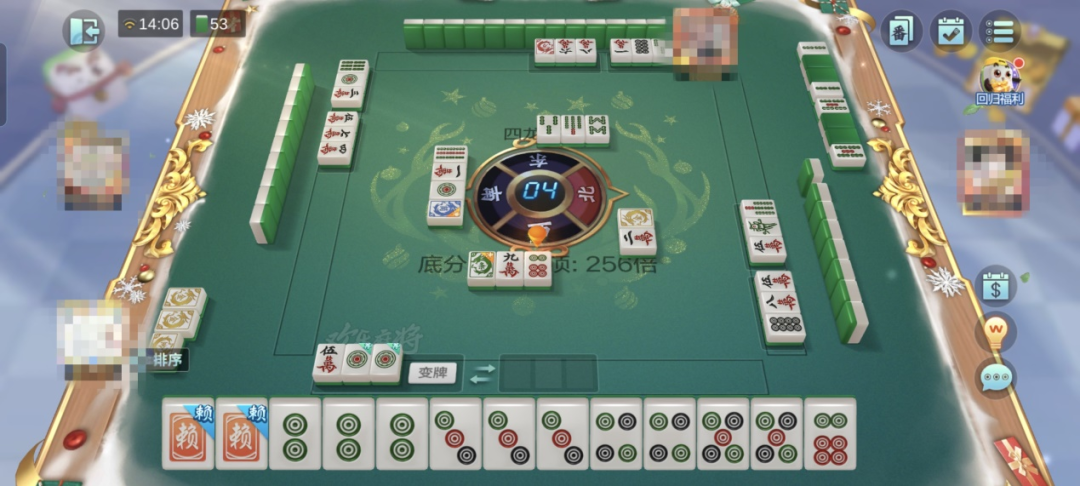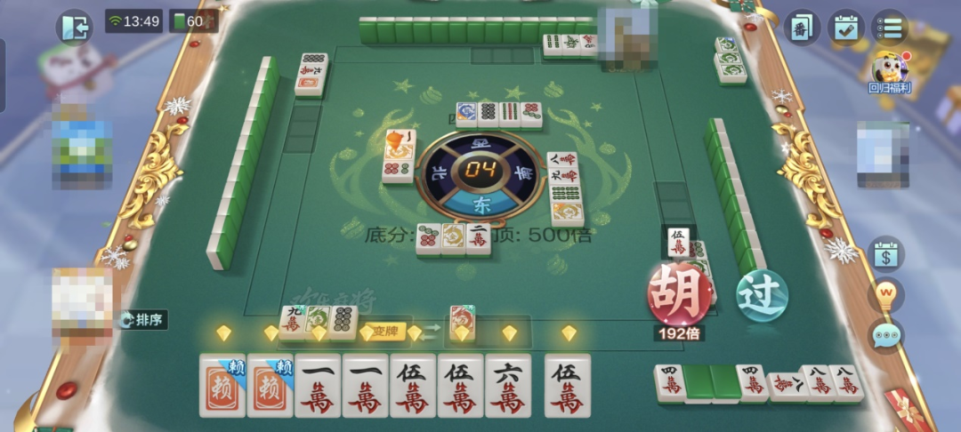 No.2 以下是红中血流玩法的实战对局截图,请问此时自摸胡牌可以赢每家多少倍游戏豆底分?