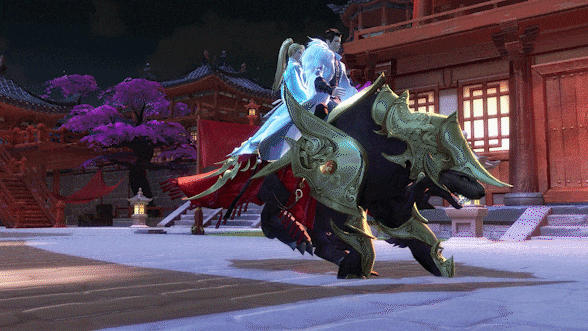 雪山之巅,行走如风,该款坐骑给人以雄壮而神秘的感觉,红色绸罗在行走间随风飘动,每一步都留下几分震慑感;神圣护甲,既保护着主人,也展现着主人的尊贵与荣耀。
