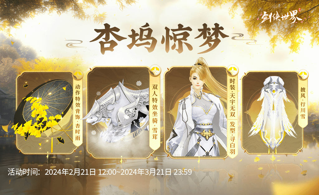 🌟本期外观奖励包括:双人特效坐骑-雪茸、双人坐骑-玄锦、动作特效背饰-杏时雨、永久披风背饰-行川雪、永久时装-天宇无双·珠晖/天宇无双·至臻/天宇无双·莹珀/天宇无双·奇巧/天宇无双·琼玑/天宇无双、永久发型-寻白羽·珠晖/寻白羽·至臻/寻白羽、永久脸饰-探芳信·奇巧探芳信·琼玑/探芳信、永久腰饰-翰墨云烟·奇巧/翰墨云烟。