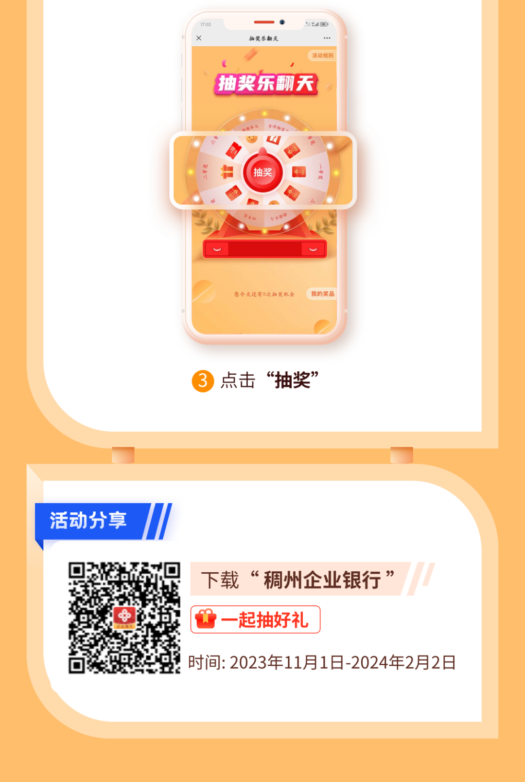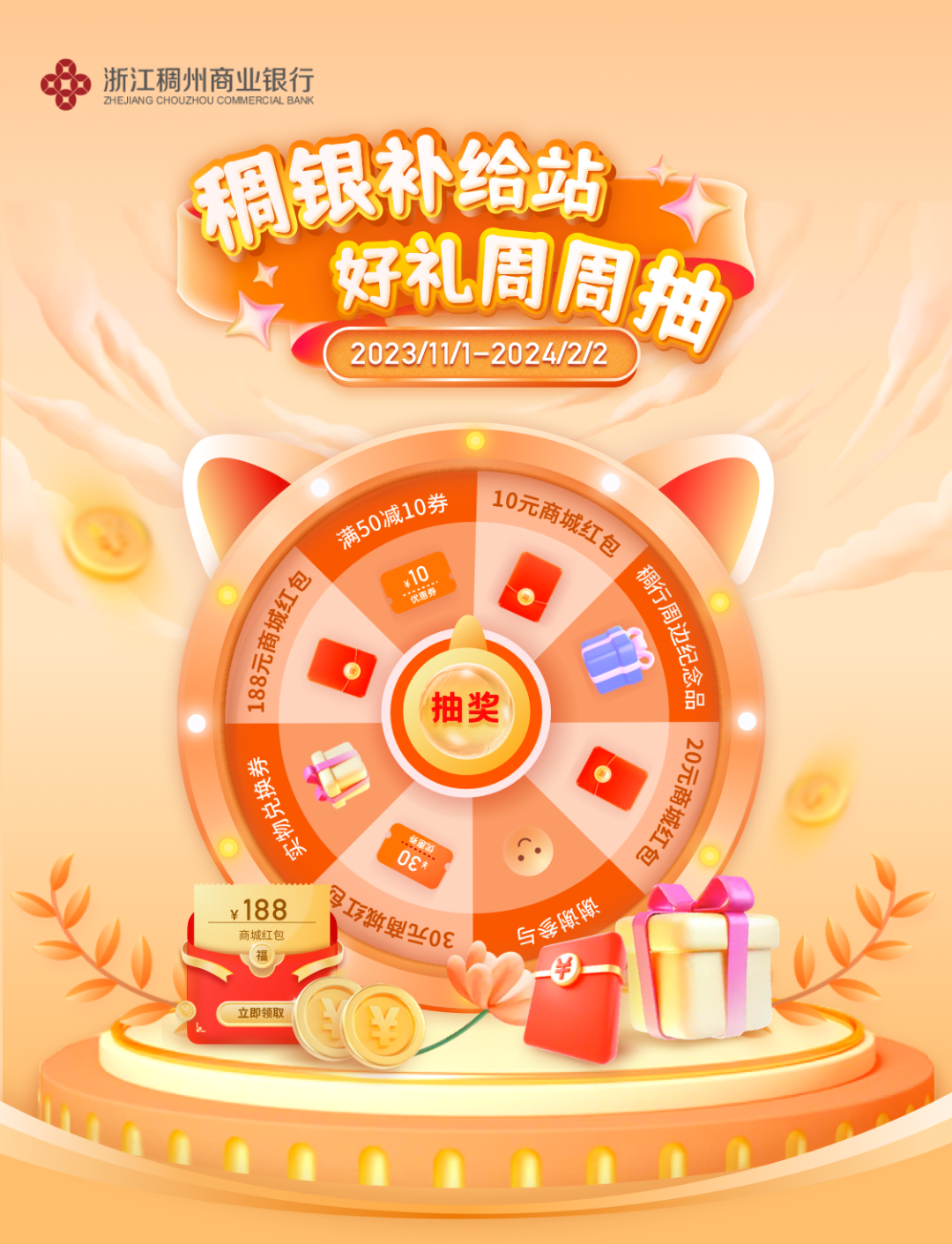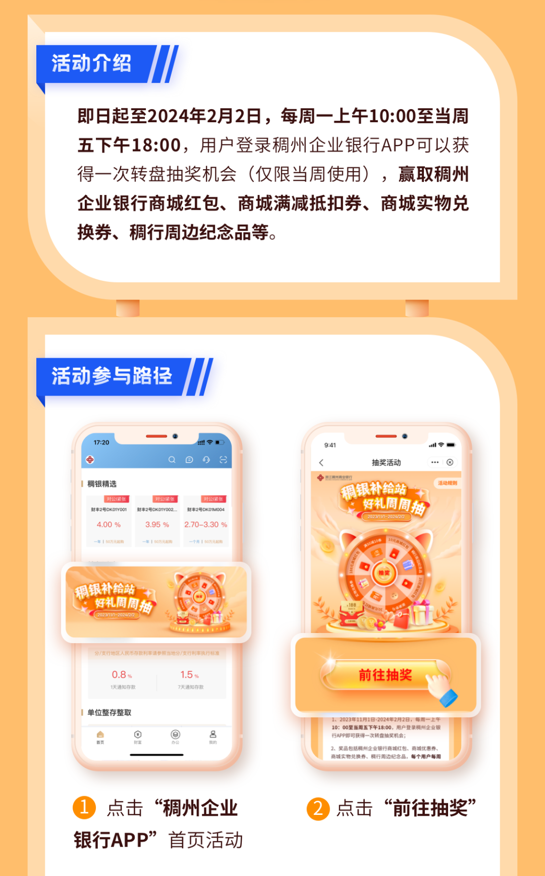 稠银补给站,好礼周周抽即日起至2024年2月2日每周一10:00至周五18:00稠州企业银行APP用户可在活动页面抽奖每周可抽一次