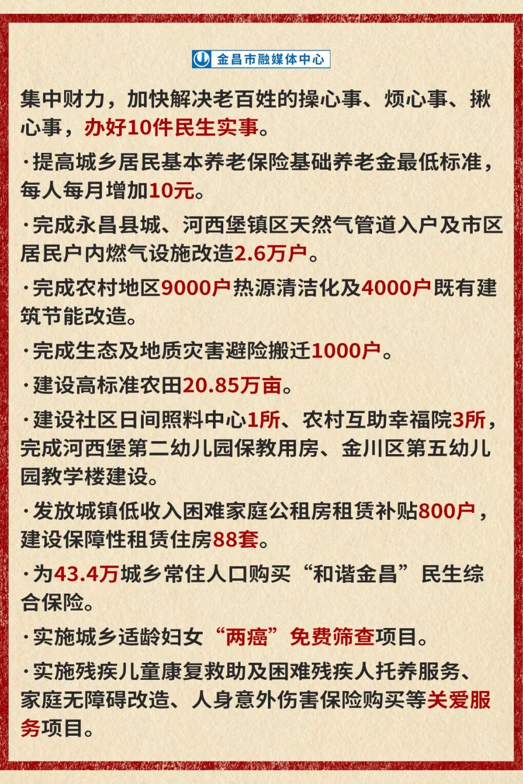 1月5日上午,金昌市第九届人民代表大会第三次会议在市行政中心隆重开幕。市委副书记、市长王方太代表市人民政府向大会作了工作报告。报告中提到了哪些民生福利?一起来看!