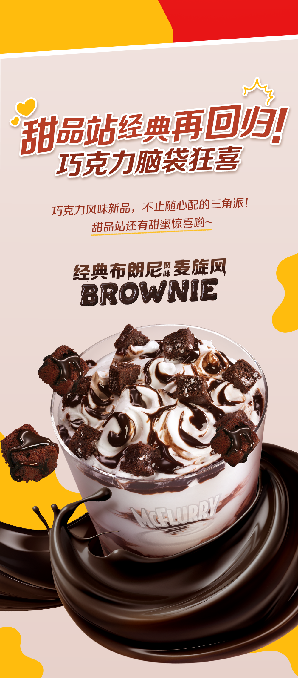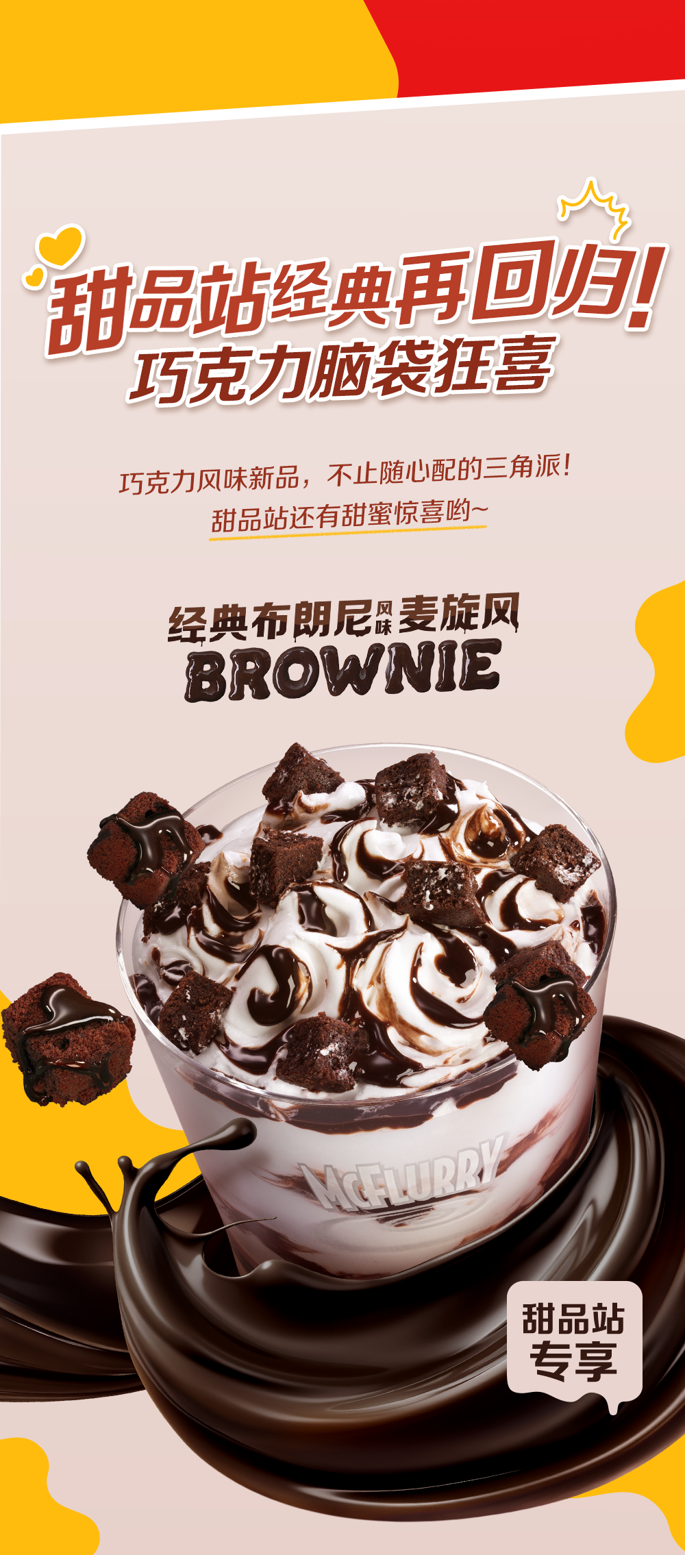 以上产品推广日期自2024年2月26日至2024年3月26日,仅在中国大陆部分麦当劳®甜品站适用,机场、火车站等交通枢纽餐厅、旅游景区餐厅等特殊餐厅除外,具体以甜品站公示为准。产品本身以外的食物形象仅为装饰目的。通过麦当劳App、麦当劳微信/支付宝小程序首页的“甜品站”频道页面,以正价购买指定单品,可享第二件指定正价单品半价优惠。指定单品以菜单显示为准,并限于有该产品供应的甜品站。寄存券需限期使用,有效期详见购券页或券面。除所推广产品外,其他物品(包括容器) 不在售卖范围内。经典布朗尼风味麦旋风含有8%的代可可脂巧克力。