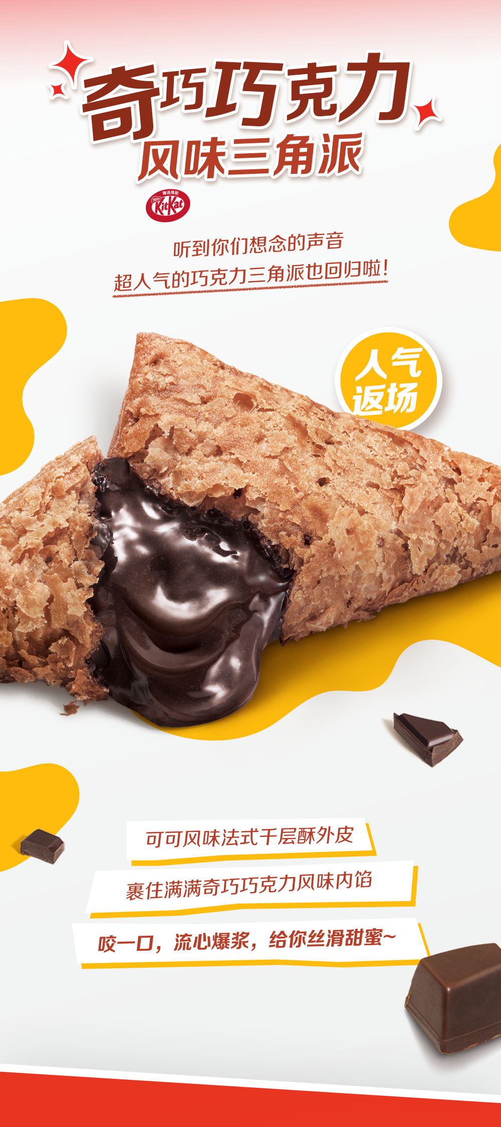 奇巧巧克力风味三角派,馅料中含有不少于30%的代可可脂巧克力。“NESTLE”、“KIT KAT”和“奇巧”是雀巢产品有限公司的商标。