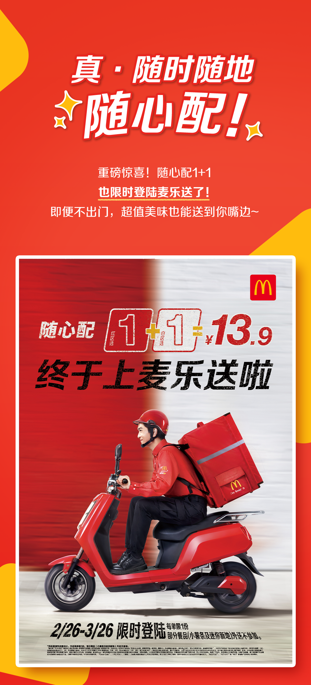 外送渠道外送费另计。外送每单限1份,部分餐品(薯条及迷你新地)外送不参加。随心配“1+1=13.9”是指从上述红区任意一款指定产品,搭配上述白区任意一款指定产品,为13.9元。红区中产品包含“双层吉士汉堡、酥酥多笋卷、麦香鸡、薯条(小,外送渠道不参加)、那么大鸡排(1份)、麦乐鸡(5块)、嘎嘣脆贡菜卷”,白区中产品包含“奇巧巧克力风味三角派(1块)、派(香芋/菠萝,1块)、迷你新地(草莓/朱古力,1杯,外送渠道不参加)、汽水(可口可乐/无糖可口可乐/雪碧/怡泉,中杯,1杯),阳光柠檬红茶(中杯,1杯)、锡兰红茶(1杯)”。上述产品自2024年2月26日起至2024年3月26日,在中国大陆部分麦当劳®餐厅售卖,机场、火车站等交通枢纽餐厅、旅游景区餐厅等特殊餐厅除外,具体以餐厅公示为准。活动渠道:麦当劳App、麦当劳微信/支付宝小程序的到店取餐及麦乐送渠道,自助点餐机。以上组合仅限当日早餐时段后供应,早餐供应时间以餐厅实际为准,至上午10:30结束。除推广产品外,其他物品不在售卖范围。如遇产品售罄,餐厅将视餐厅供应情况为您替换价格相当的产品。以餐厅实际供应为准。不与其他优惠同享。“Coca-Cola”、「可口可乐」、「雪碧」、[怡泉]和弧形瓶是可口可乐公司的商标。
