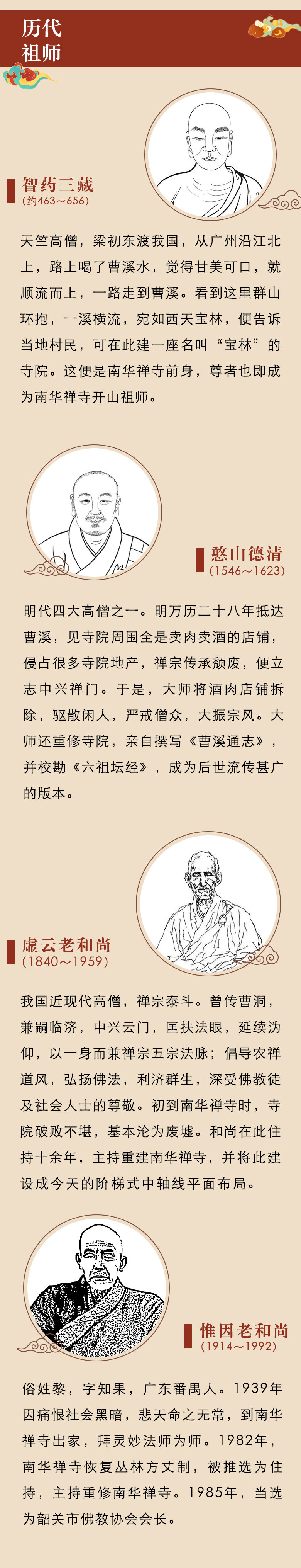 西域高僧智药三藏尊者梁初东渡中国,从广州沿江北上。至曹溪口掬水饮之,觉水甘美可口,遂溯源而上,至曹溪,见群山环抱,一溪横流,宛如西天宝林。师乃告村民,此山可建梵刹,可名“宝林”。自始建寺,乃南华禅寺开山祖师。