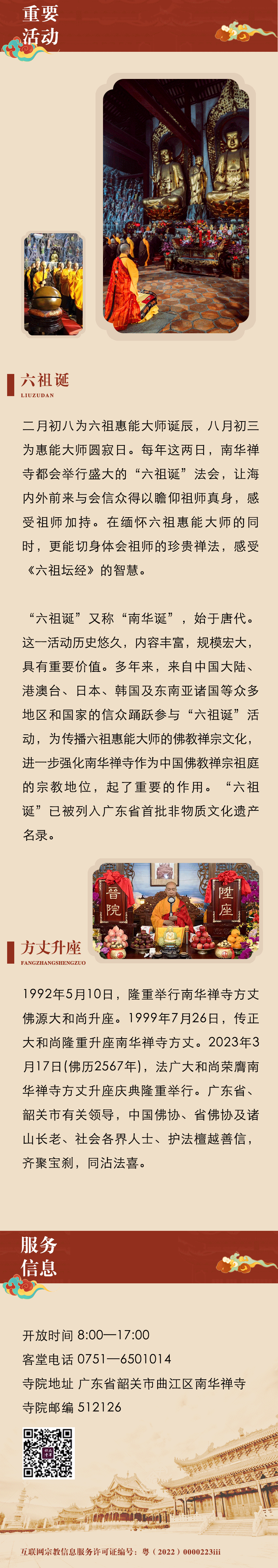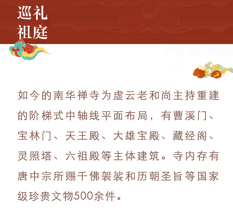 在南华禅寺山门外曹溪广场,以《六祖坛经》为主题,是传承南华禅宗传统文化的重要载体。2019年,南华禅寺正式设立 “海峡两岸交流基地”,并在曹溪广场举行了隆重的授牌仪式。