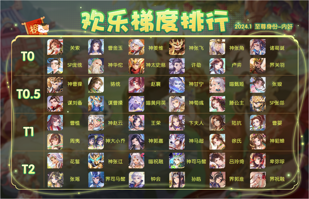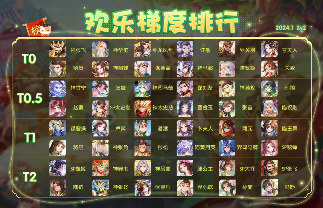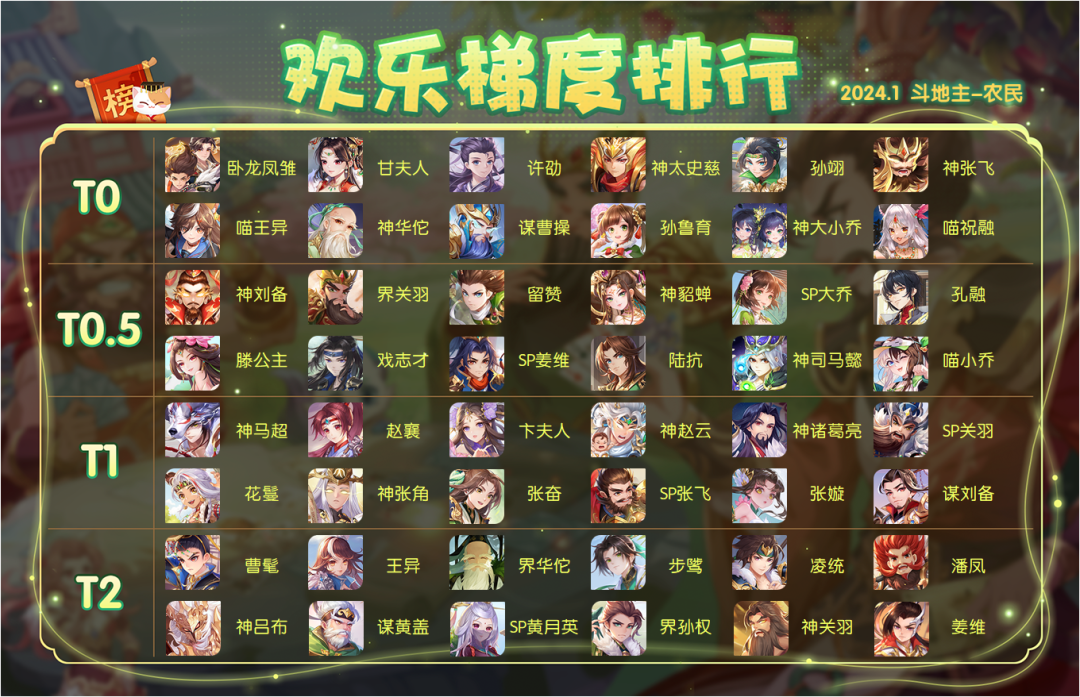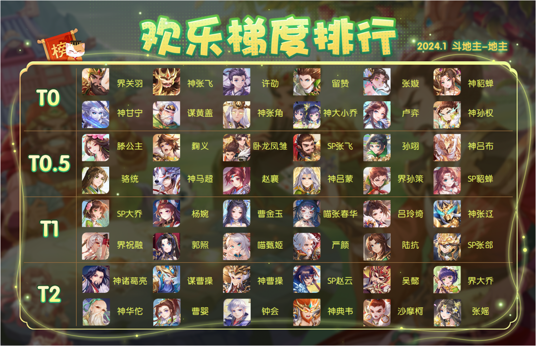 3.本期胜率排行所有对局数据均来自于游戏内 2024.1.12-2024.2.7【至尊身份场】【欢乐斗地主】【2V2排位场】竞技对局,为保证数据公平公正,武将出场率需大于0.5%才会被列入统计范围,数据真实有效。(注:上周欢乐斗地主-自选手牌对局数据不在统计范围内)