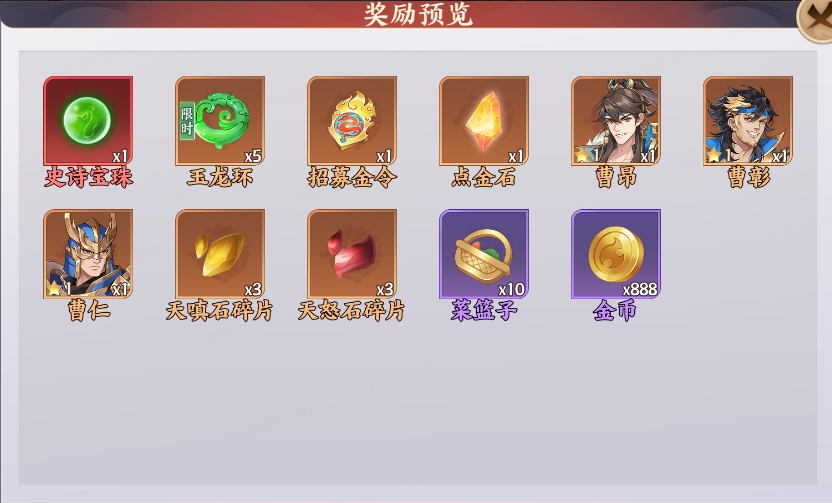 登录3日:玉龙环30;金币3000;招募金令*1