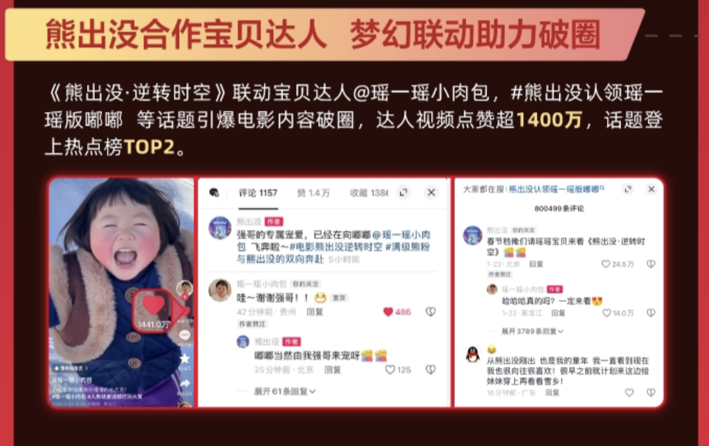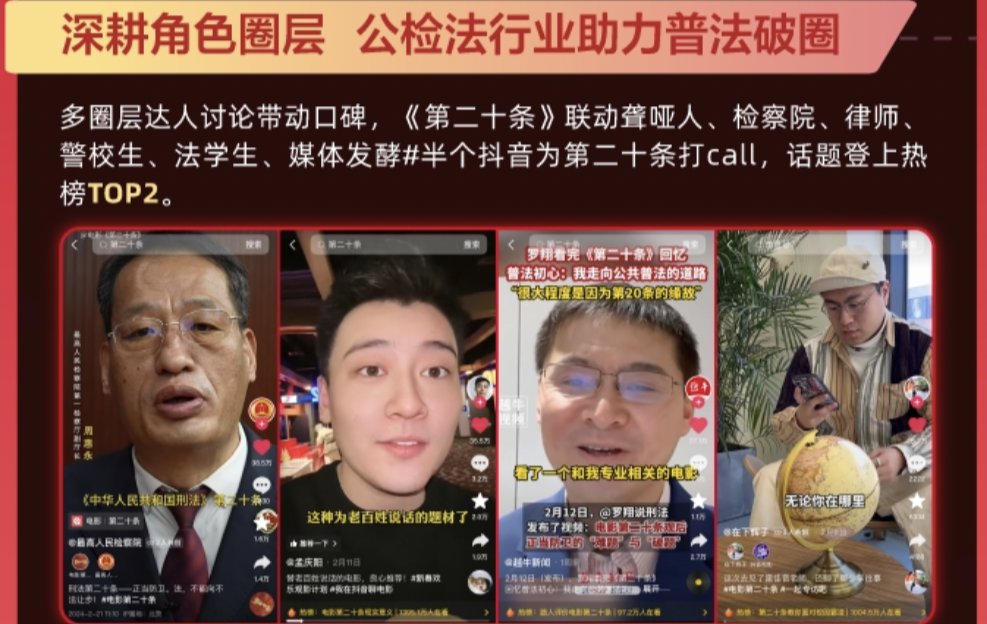 《熊出没•逆转时空》结合影片儿童题材,与千万粉丝达人@瑶一瑶小肉包 隔空互动,银幕内外拉近与观众的距离,达人视频点赞超1400万;《第二十条》则联动检察官、律师、法学生等达人展开话题发酵,贴近角色相关的观众圈层,#半个抖音为第二十条打call 话题登陆热榜TOP2。由此发现,让观众爱看、与观众有关的内容能够调动观影和讨论热情,甚至吸引观众进行影片衍生内容的创作。