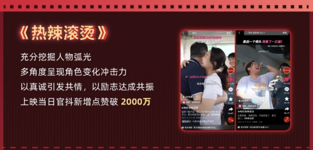 春节档期间,官抖百万赞视频达120个,在高热度视频中可以发现,观众喜爱能够传递角色魅力、情感表达等贴合电影本身的内容。《热辣滚烫》官抖发布多支挖掘人物弧光的短视频,例如通过出拳动作、眼神的特写剪辑,充分展现贾玲饰演角色的前后蜕变,以内容细节带来情感冲击力,影片上映当天官抖收获2000万+点赞。围绕电影内容本体,找到作者表达与用户喜好的平衡点,能够引发用户的主动发声、参与。