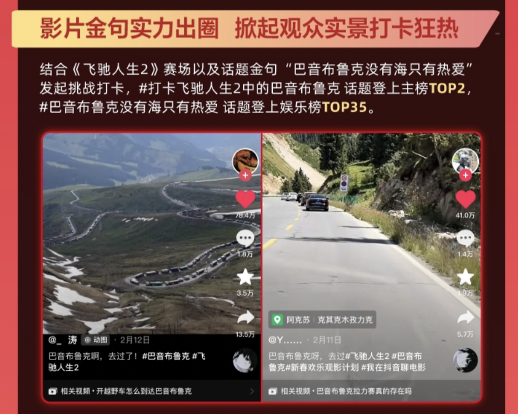 面向用户的真诚表达能够进一步推动内容出圈。《飞驰人生2》中的话题金句“巴音布鲁克没有海只有热爱”引起用户高反响,《飞驰人生2》结合话题金句及影片赛场场景发起挑战打卡,积极回应用户热情,#打卡飞驰人生2中的巴音布鲁克 话题登至主榜TOP2,#巴音布鲁克没有海只有热爱 话题登上娱乐榜TOP35。