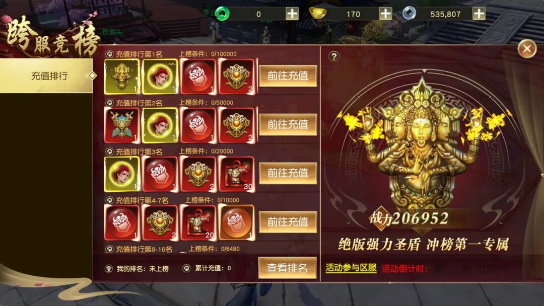 活动期间,根据英雄累计消费灵玉进行跨服排名,活动结束后根据最终排行名次发放对应的豪华奖励,玩家通过消耗灵玉(抽奖、商城购买、VIP礼包等)进入排行榜。当活动结束之后,上排行榜玩家根据排名不同,将有机会获得金色天佛圣盾、红色罗刹剑盾、金色魂石-哪吒等豪华奖励,机会不容错过,快来参与吧!