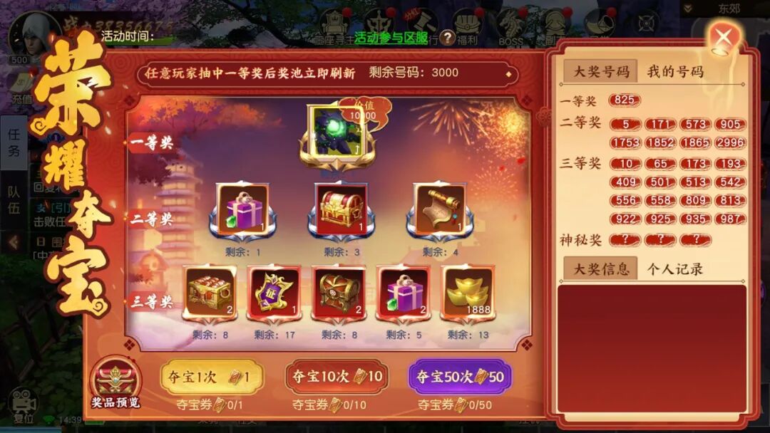 1、玩家通过消耗夺宝券进行抽奖,奖品由高到低分为5个档次:一等奖、二等奖、三等奖、神秘奖和普通奖;