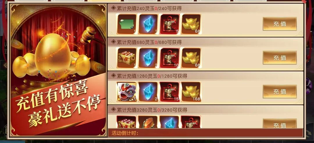 1、活动期间进行充值参与抽奖有机会获得大量灵玉;