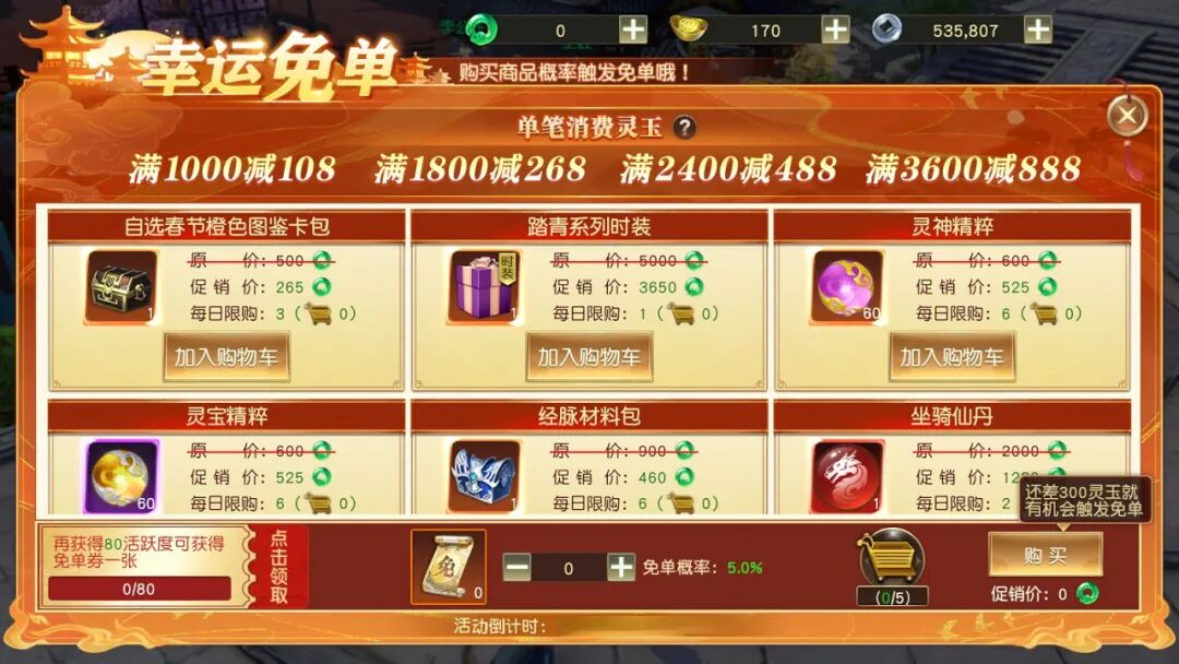 3、购物车商品折扣价满300灵玉时,有概率享受免单,免单成功全额返还本次购买消耗灵玉;