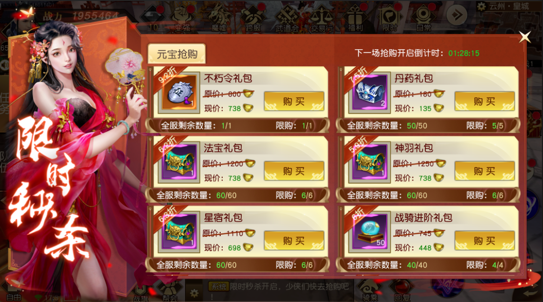 活动说明:活动期间,可通过元宝抢购秒杀各类折扣礼包,玩家可以优惠价秒杀想要的礼包,开启期间每日12:00和18:00将刷新礼包。