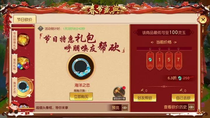 活动说明:活动期间,每天完成活动任务领取砍价锤和帮砍锤。使用砍价锤可以为礼包进行砍价,礼包内含海洋之恋头像框、宝石等精彩豪礼!使用帮砍锤还可以帮助好友砍价且获得协助礼包哦!