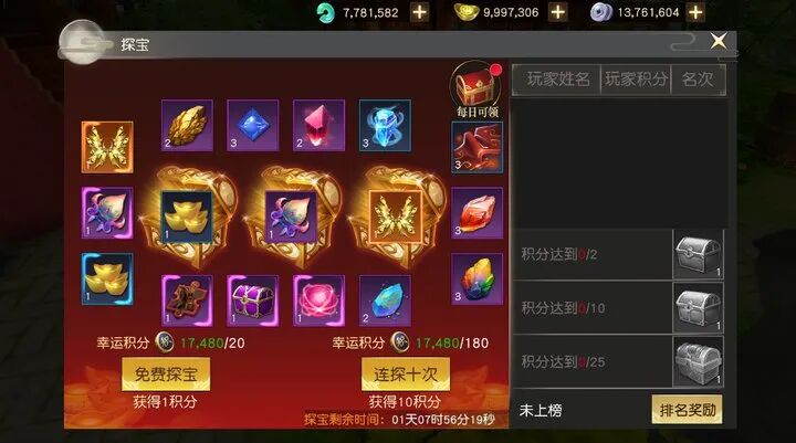 活动说明:购买幸运积分进行连探10次,达到对应的积分可以领取对应的豪华宝箱,探宝更有概率获得翅膀-幻彩蝶翼!