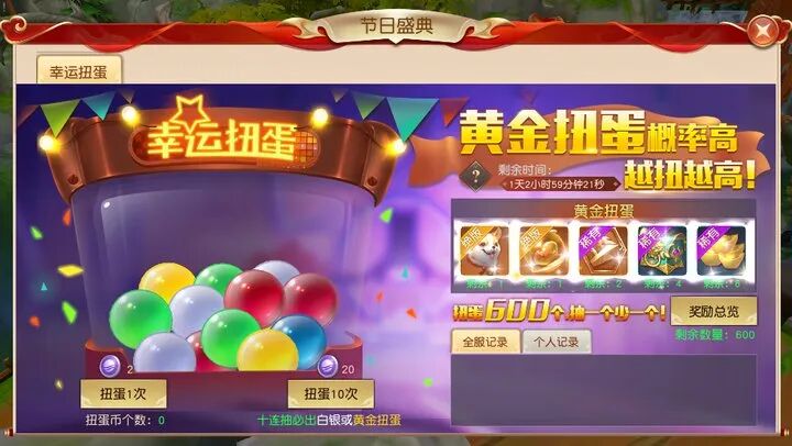 活动说明:活动期间玩家可以通过消耗扭蛋币进行扭蛋抽奖。十连抽必出白银或黄金扭蛋,单抽暴击黄金扭蛋不是梦,至尊宠物狗不理柴犬灵魄和稀有宠物升星材料等你来拿!同时有双档登录+每日限购+跨服boss可以多多获得扭蛋币材料助力开抽!