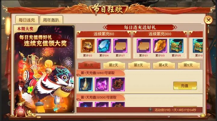 活动说明:活动期间每累积充值满指定额度,可获得充值礼包一份。充值越多奖励越丰厚,多充多得!