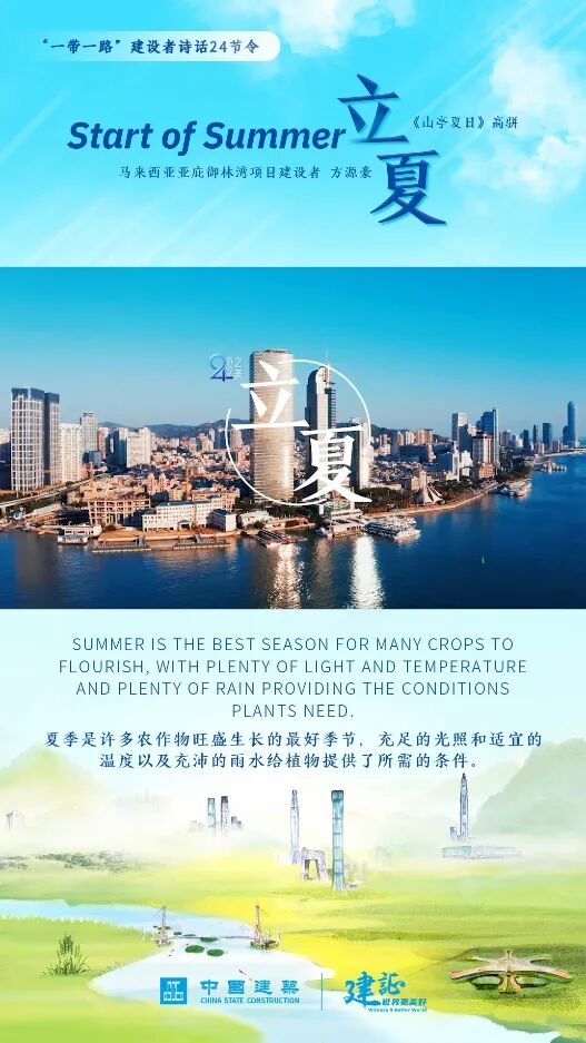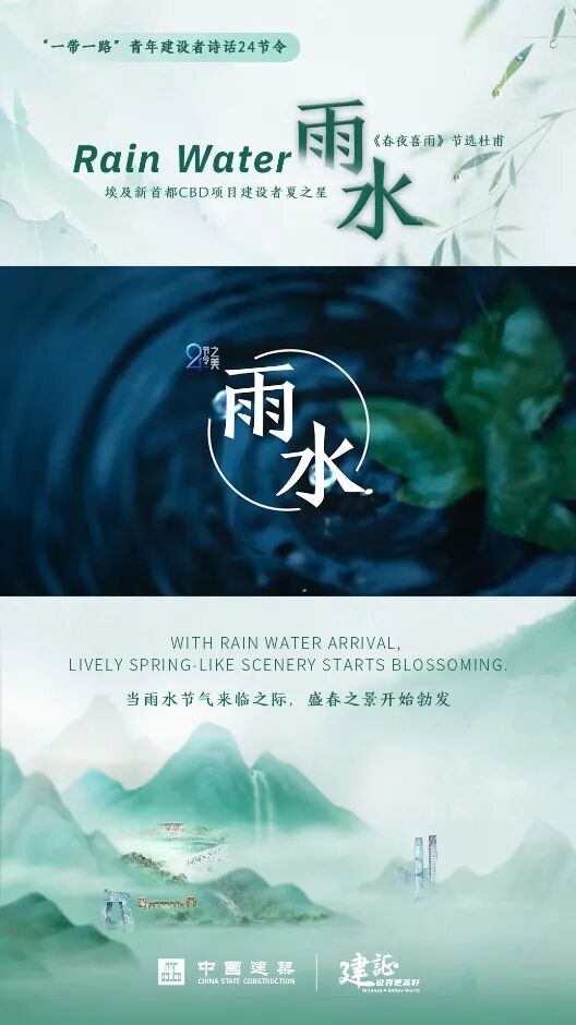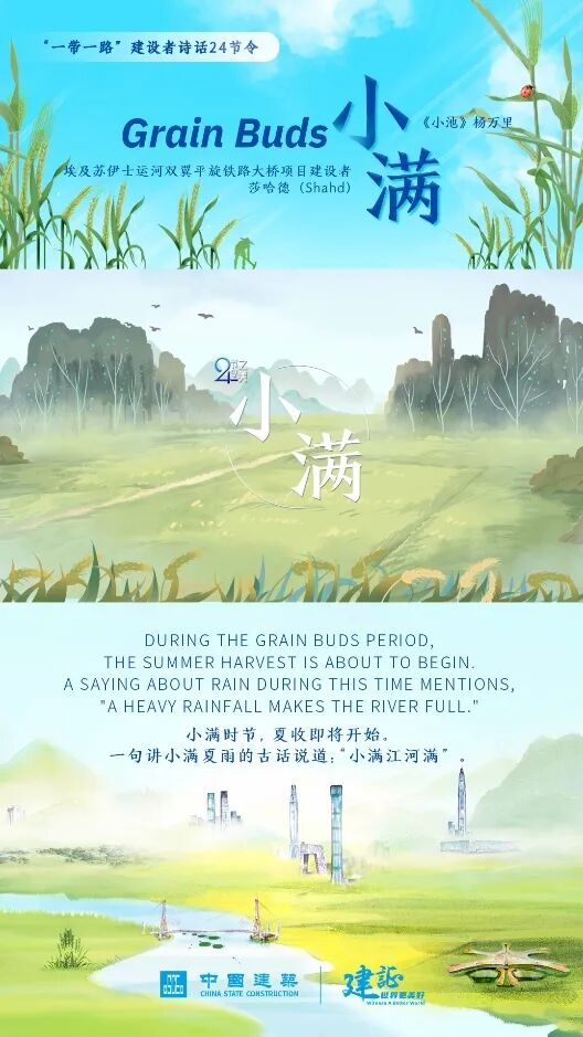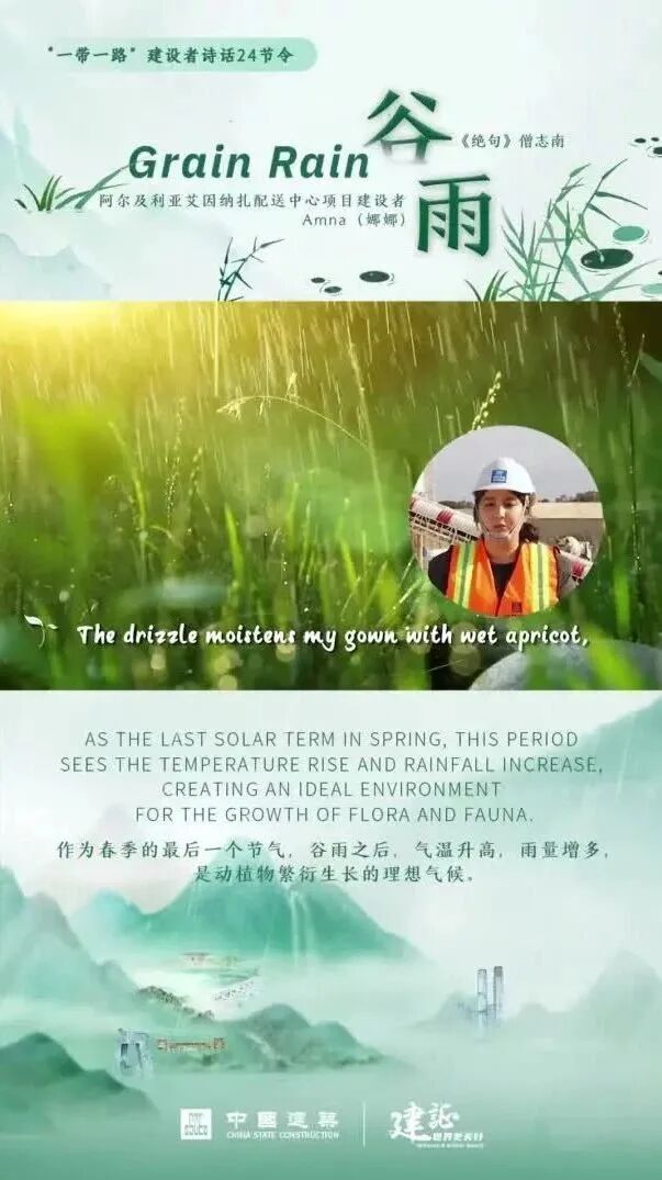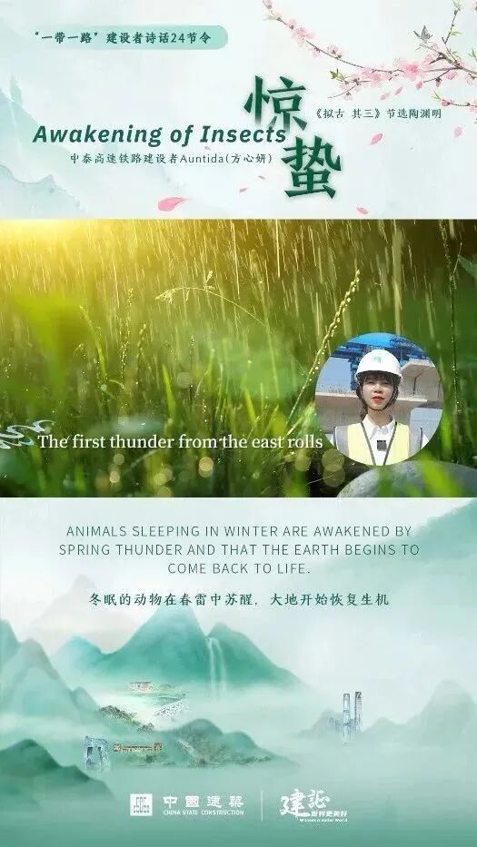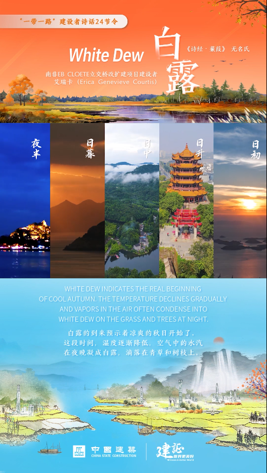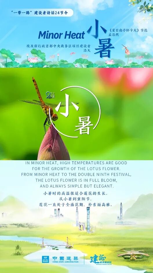 从沙漠腹地的埃及新首都CBD,到穿越丛林的中泰高铁,再到通达世界的柬埔寨新金边国际机场,《“一带一路”建设者诗话24节令》每期邀请一位项目属地员工,站在中国建筑承建的“一带一路”重点民生工程前,以中英文双语朗诵中国古诗词,在语言的碰撞和交融中,传颂人民对美好生活从古及今的不懈追求,抒发了共赴城市新生、百姓安居、交通畅达、经济繁荣、民心相通的美好愿景。