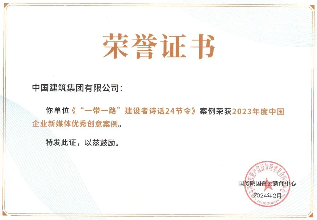 近日,由国务院国资委宣传局、中国记协国内工作部指导,国务院国资委新闻中心、中国企业媒体联盟主办的第十届“国企好新闻”推介活动优秀作品发布仪式在京举行。中建集团策划制作的《“一带一路”建设者诗话24节令》获2023年度中国企业新媒体优秀创意案例。