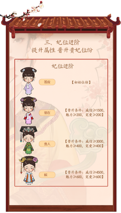 掌柜需要努力提高威信、魅力、宠爱这3种妃嫔属性,才能进阶更高级的妃位。