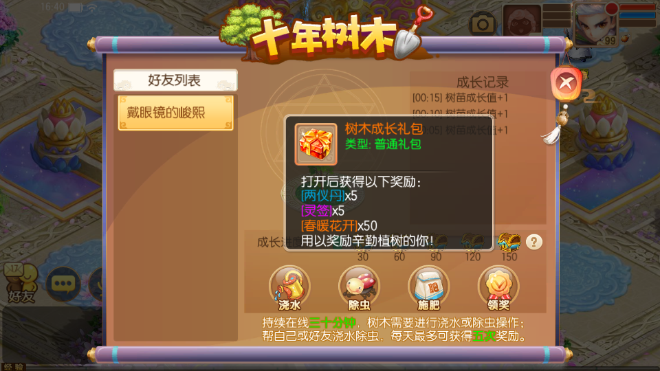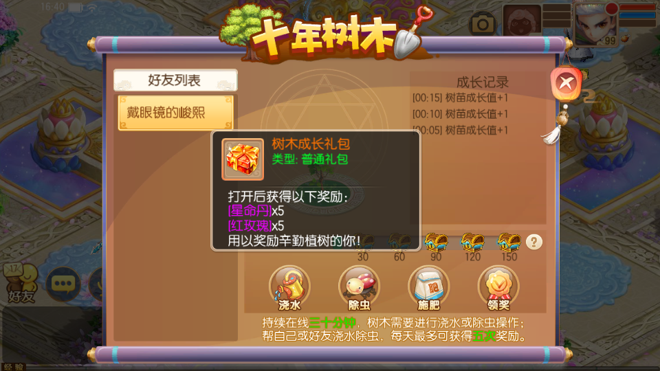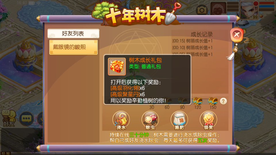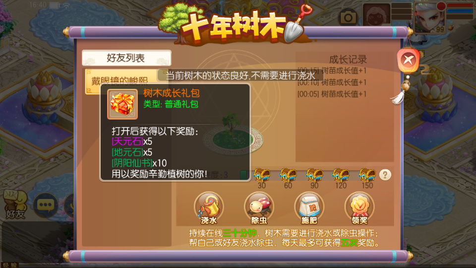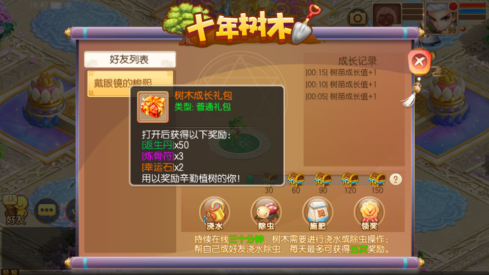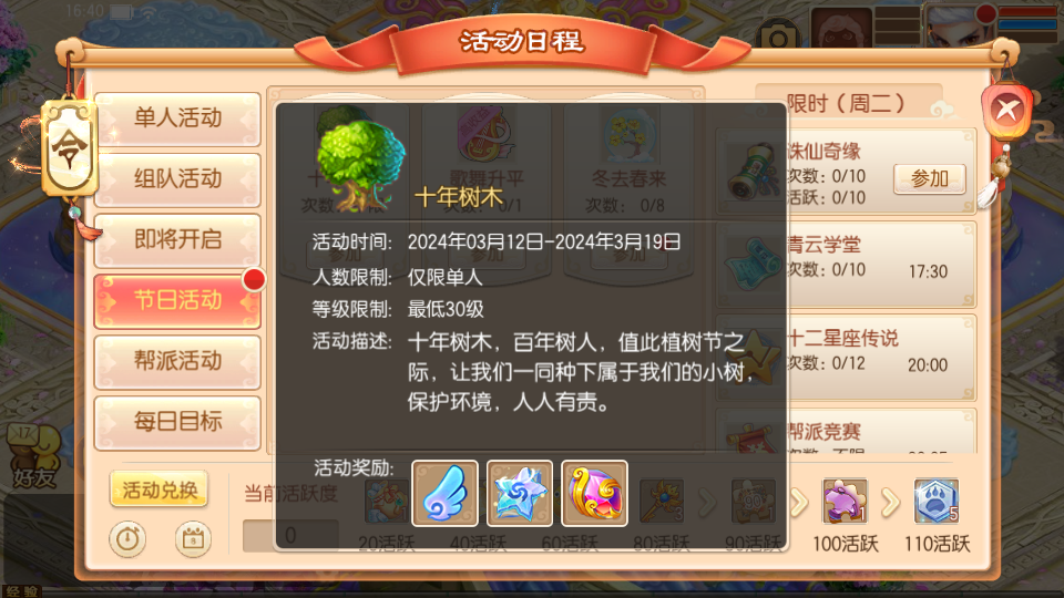 活动期间,等级在30级以上的少侠可以单人参加这项活动。参与活动将可以获得树木成长礼包,打开礼包可以获得各种好礼哟!