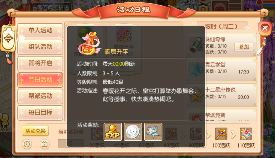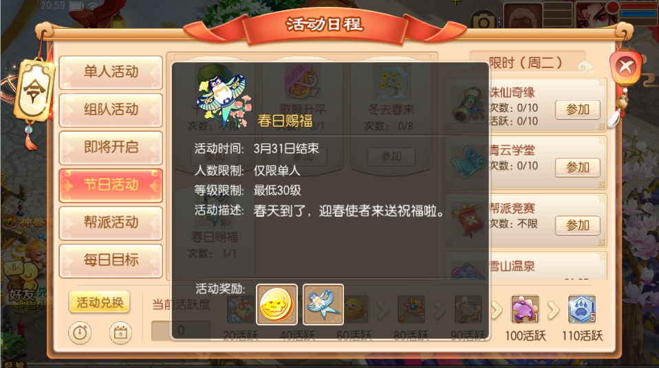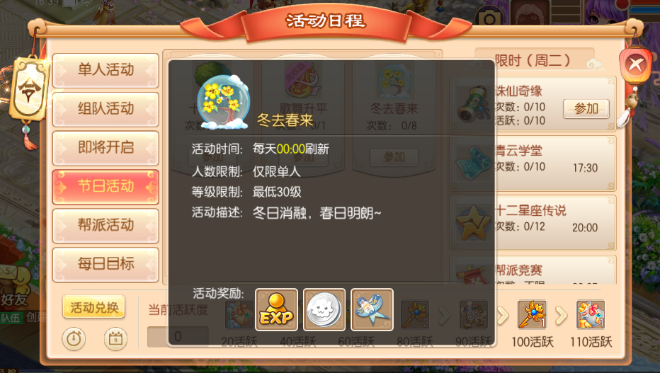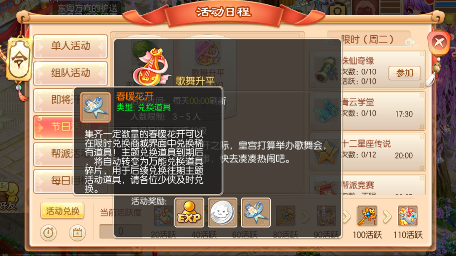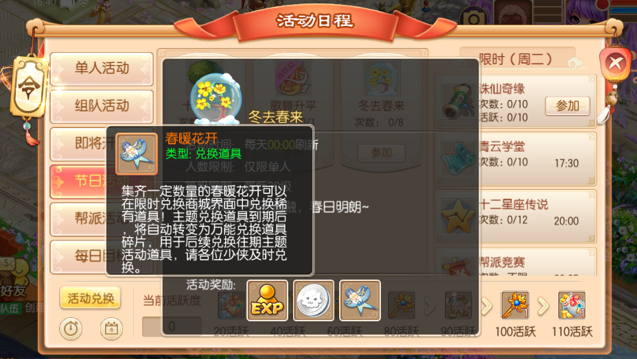 活动期间,等级在30级以上的少侠可以单人参加这项活动。参与活动可以获得兑换道具春暖花开,用于在限时兑换商城中兑换稀有道具。