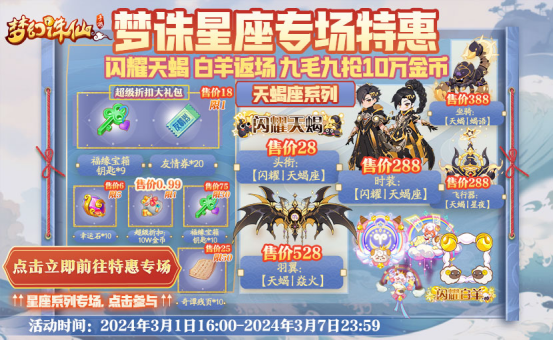 各位少侠注意了哟!3月1日起,梦幻诛仙手游星座专场特惠将准时上线!这次的超值礼包将通过商城直售,除了天蝎、白羊两款星座时装返场之外,更有超级折扣礼包,让你九毛九抢10万金币!商城直售入口如下,少侠们请按需购买哦~