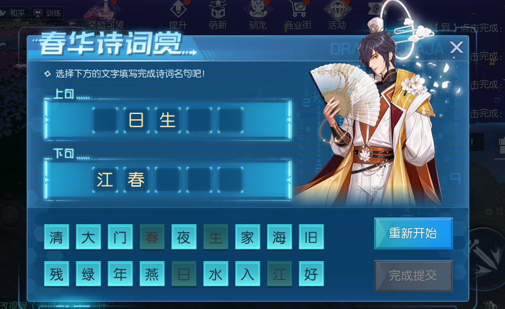 3月1日0:00-3月13日24:00期间,完成每天的诗词填写赏析,即可获得经验、金币、秀野踏青礼盒、星海鱼影礼券等好礼哦~