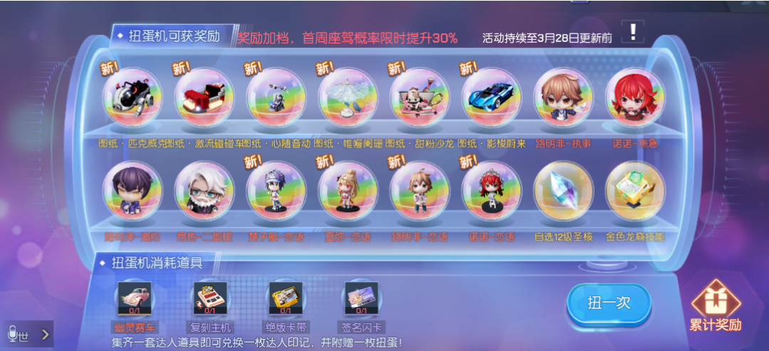 2月29日更新后-3月28日更新前,扭蛋机再度开启限时回馈!首周座驾抽取概率将提升30%哦!
