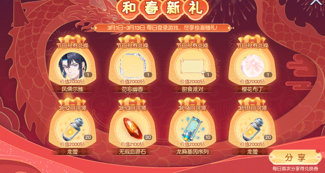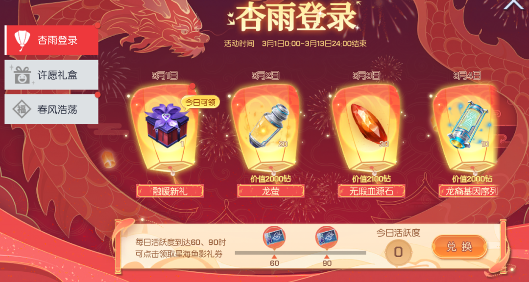 3月1日0:00-3月13日24:00期间,每日登录及达到指定活跃度,即可领取龙萤、无瑕血源石、龙裔基因序列、时空之砂、星海鱼影礼券等好礼~