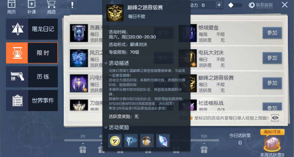 第七届巅峰之路晋级赛报名阶段终于开启啦!等级在70级以上并且有意向参与的同学注意哦,3月1日00:00-3月6日23:59为报名期,大家可以通过活动日历“限时”或者“历练-竞技”中的“巅峰之路晋级赛”来创建战队。