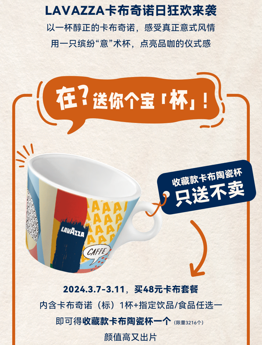 1.本活动自2024年03月07日至2024年03月11日;活动期间,选购卡布奇诺日套餐1份,套餐含:卡布奇诺(标)一杯及指定产品一份,指定产品可选:卡布奇诺(标),美式(标),谷物迷你可颂,脆片夹心泡芙6只装,原味可颂。即可得LAVAZZA收藏款卡布奇诺陶瓷杯1份,共限量3216份,发完即止;