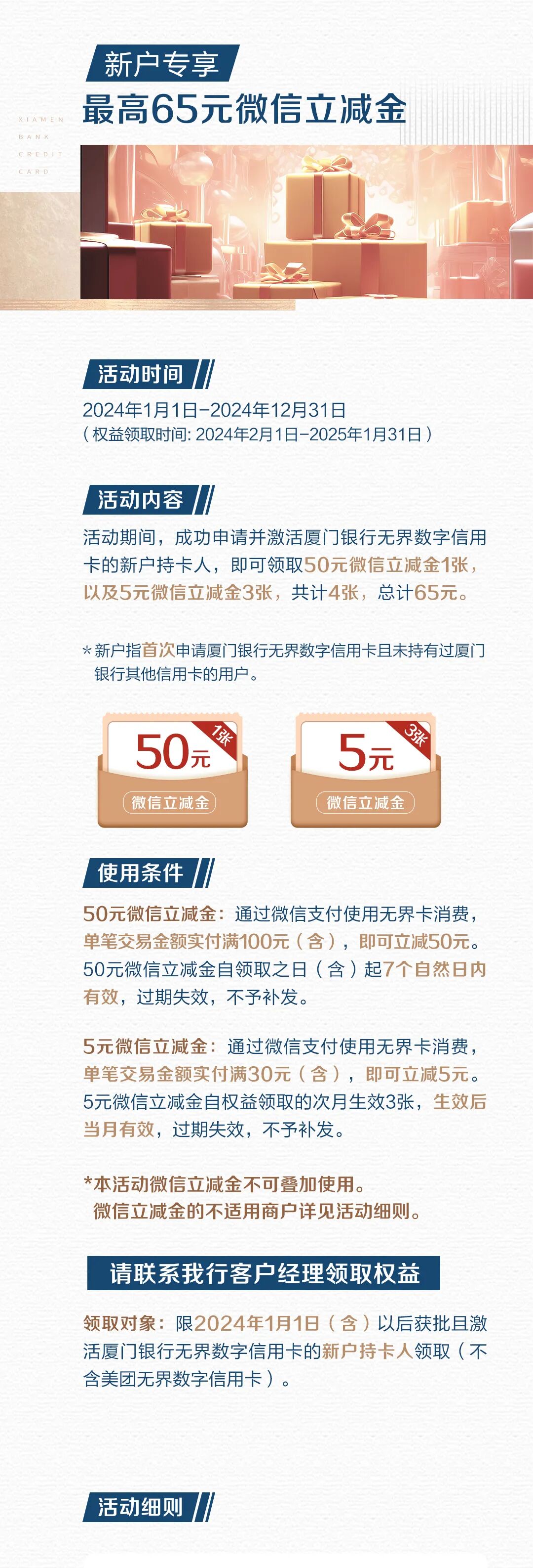9、在法律许可范围内,厦门银行对本次活动有调整、更改及取消的权利(包括但不限于参加资格、交易时间及优惠方式等),调整、更改及取消经厦门银行官方网站或“厦门银行”微信公众号提前公告后生效。如活动变更对已发放微信立减金的客户权益产生影响,将通过微信消息推送或短信等方式进行通知,请注意查看。