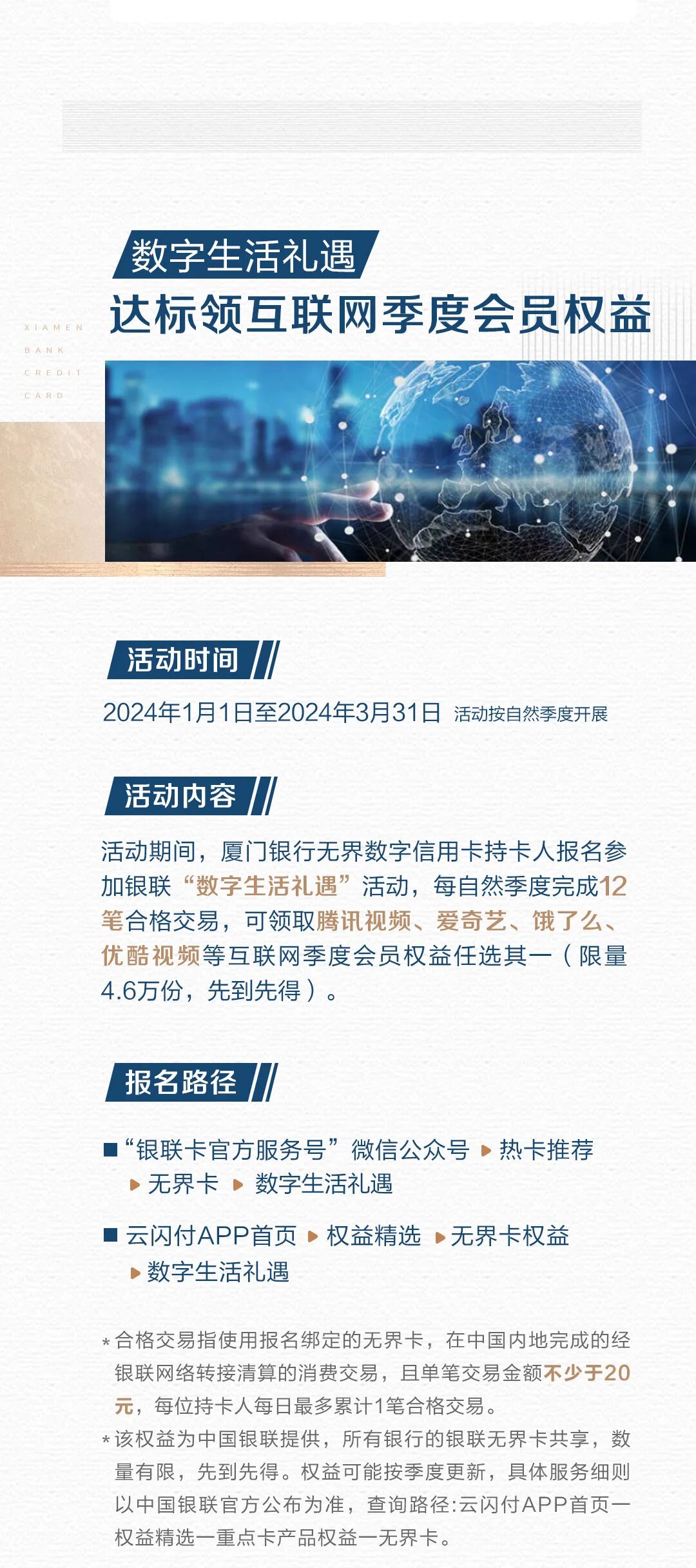b.达标用户于活动页面点击领取互联网会员权益后,将由后台系统直充进报名参加本活动的手机号对应的账户中,如持卡人本身已有相应会员身份,会员时长会在之前的会员到期时间上自动顺延。