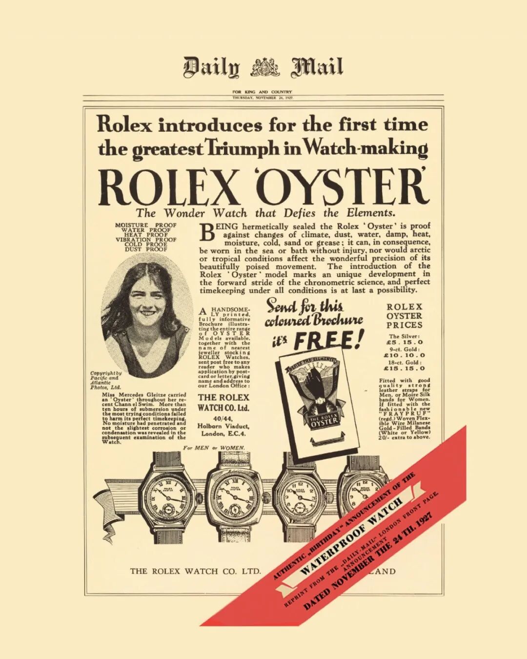 20世纪早期是探险和运动挑战的时代。在制表界,劳力士创始人汉斯・威尔斯多夫(Hans Wilsdorf)力求拓展界限,决意以但是一项超卓发明取替传统怀表──佩戴在手腕上的腕表,且防尘防水。1926年,随着首只防水劳力士蚝式腕表问世,他的愿景终于成真。为推广腕表,他邀请来自布莱顿的打字员梅赛迪丝・吉莉丝(Mercedes Gleitze)──首位成功横渡英吉利海峡的英国女性──于翌年佩戴劳力士蚝式腕表横渡海峡。在冰冷的海水浸泡逾10小时后,腕表仍能精准报时。吉莉丝完成创举,并成为首位劳力士代言人。