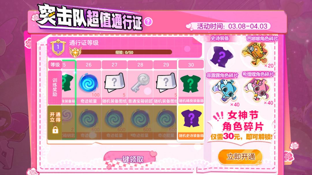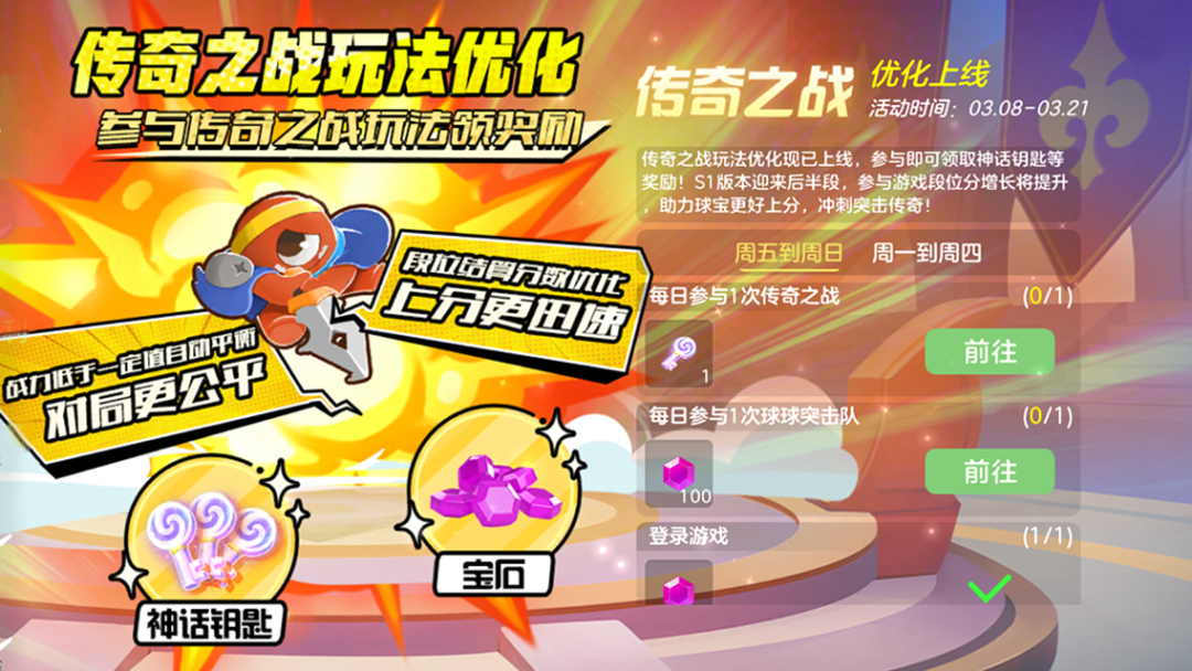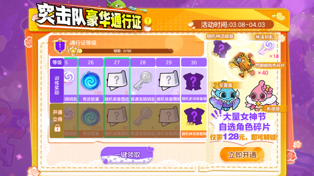 3月8日-4月3日,女神节限定突击队通行证上新,自选女神角色助力球宝闯关冒险!128元解锁豪华奖励,立得女神角色(芭娜娜碎片/菲露露/希哩哩)自选,选择与你相伴的女神展开全新的冒险吧!还有神话随机箱子与海量神话钥匙领到手软!30元解锁超值奖励,芭娜娜/菲露露/希哩哩碎片三选一,还有史诗随机箱子,神话钥匙等超值奖励助力闯关冒险!