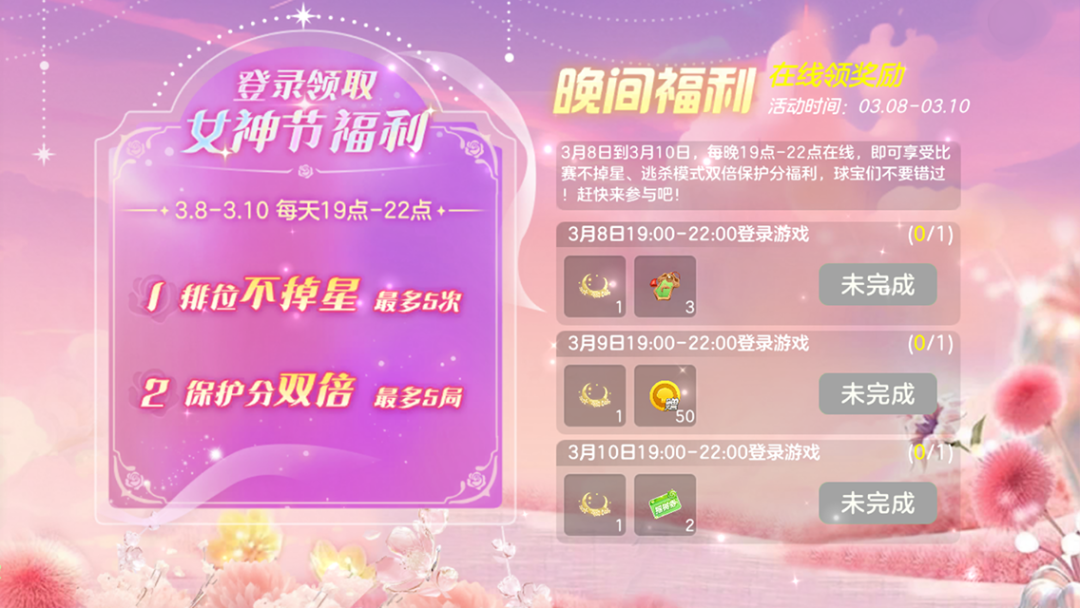 3月8日-3月10日,女神节福利享不停,排位也有好礼相赠!活动期间每天19:00-21:00进行排位5局不掉分,同时5局内保护分双倍,助力球宝女神节排位上分!期间登录游戏还可领取礼物「月亮船」等惊喜好礼!