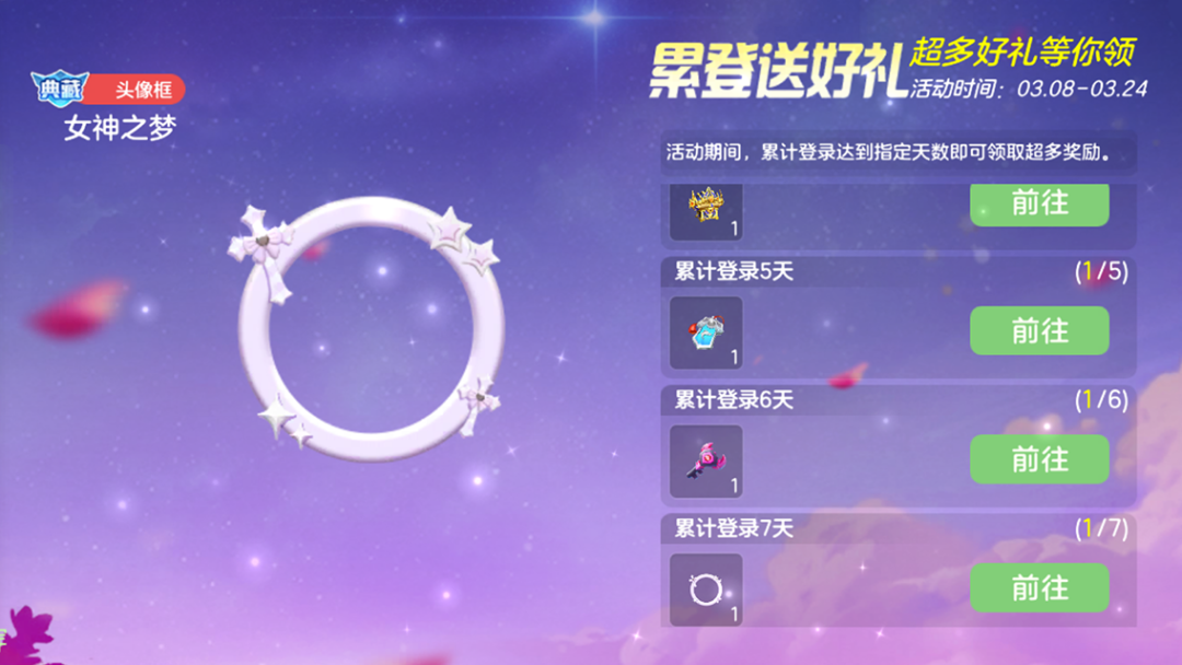 3月8日-3月24日,女神节盛典好礼享不停,累计登录领海量女神福利!活动期间累计登录游戏即可获得神祈珍宝箱、超大奇妙宝箱钥匙、限定头像框等超值好礼!