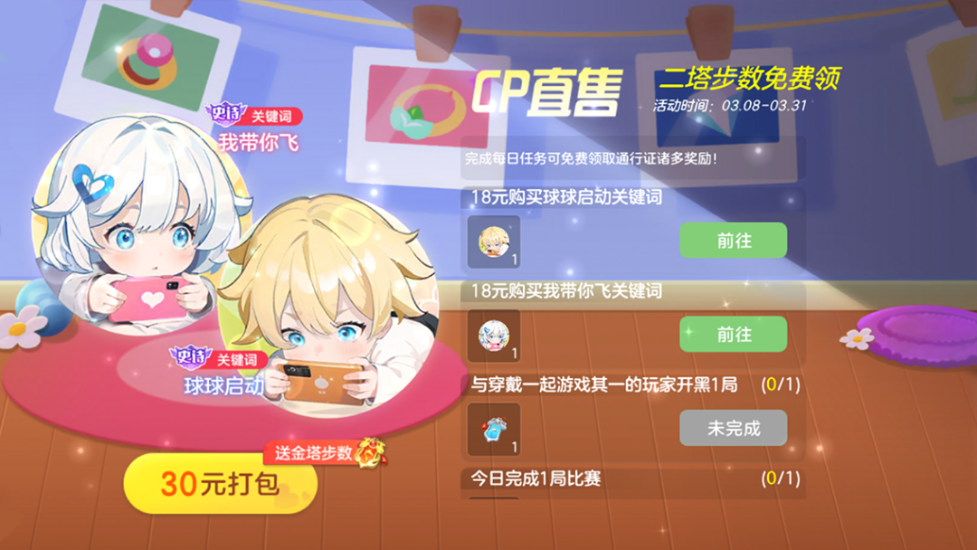 3月8日-3月31日,CP一起玩游戏才是最开心的事!史诗关键词「球球启动」&「我带你飞」上线直售礼包,30元即可获得!完成专属任务还可获得三塔步数、女神节高级盲盒,超大奇妙宝箱钥匙等诸多超值豪礼!快来和你的cp一起启动球球玩游戏~