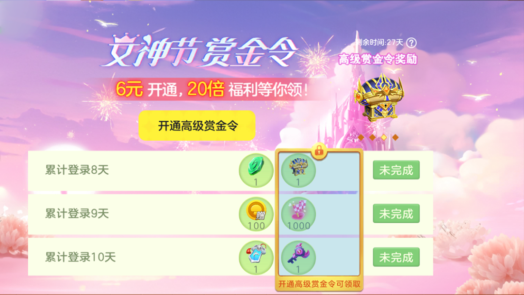 3月8日-4月3日,6元开通,20倍返利!女神节赏金令活动限时开启!完成任务即可领取海量奖励!女神节亲密称号「狗子」,超大奇妙宝箱钥匙,海量亲密里程等好礼超值相赠!快来完成任务,领取女神节的赏金吧!